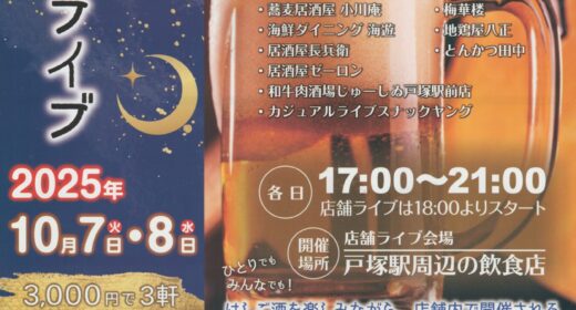 2025年10月7日(火)、8日(水) 各日17:00~21:00店舗ライブ18:00よりスタート3.000円で3軒はしご酒ライブが楽しめます。チケッ...