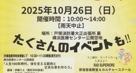 開催日 2025年10月26日(日) 開催時間 10:00~14:00(雨天中止)開催場所 戸塚消防署大正出張所 裏 横浜医療センター公開空地 フリーマーケットやミ...