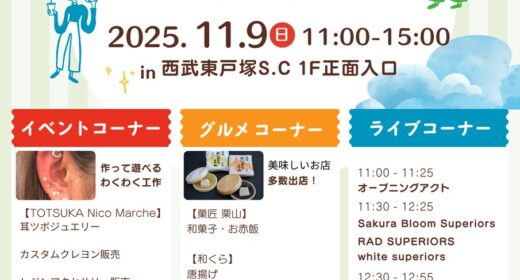 2025.11.9(日) 11:00~15:00 西武東戸塚S.C 1階正面入口イベントやライブコーナー、美味しい店などなど詳しくはポスターをご覧ください。(お...