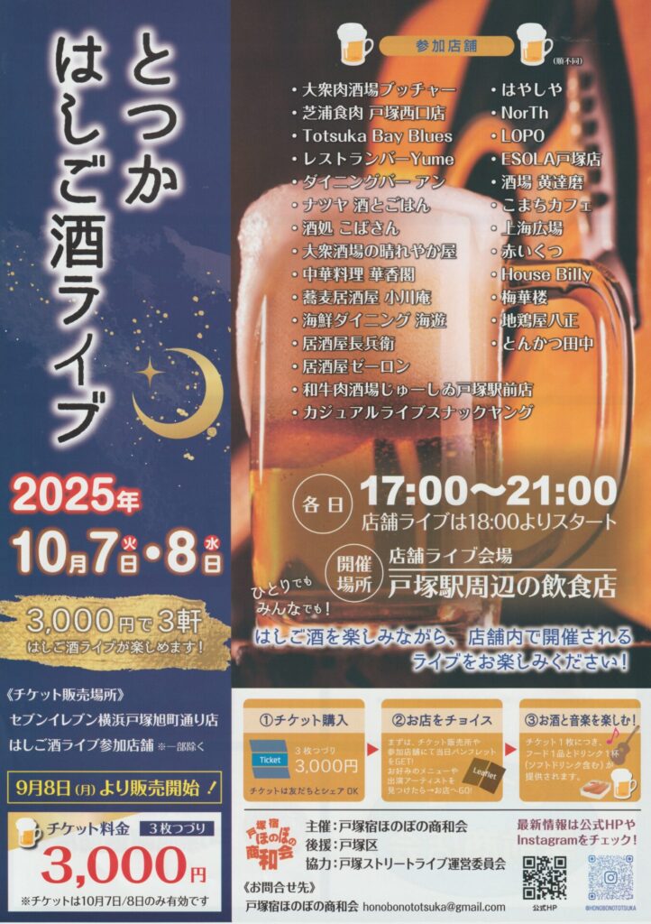イベントのお問合せや各店舗のライブスケジュールにつきましては、主催の戸塚宿ほのぼの商和会のホームページをご覧ください。